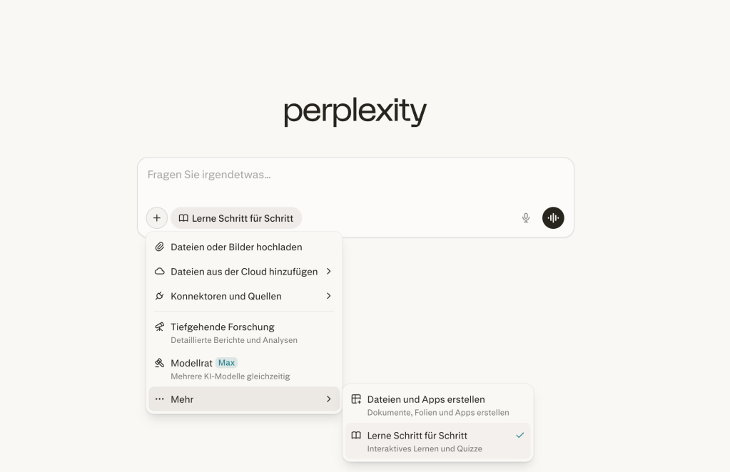 Besonders praktisch: Die KI hat einen Suchmodus namens “Lerne Schritt für Schritt”, in der sie Sachverhalte detailliert erklärt. Die KI kann dir zudem Quizzes erstellen, indem du dein Wissen überprüfen und den Schweregrad der Fragen anpassen kannst.