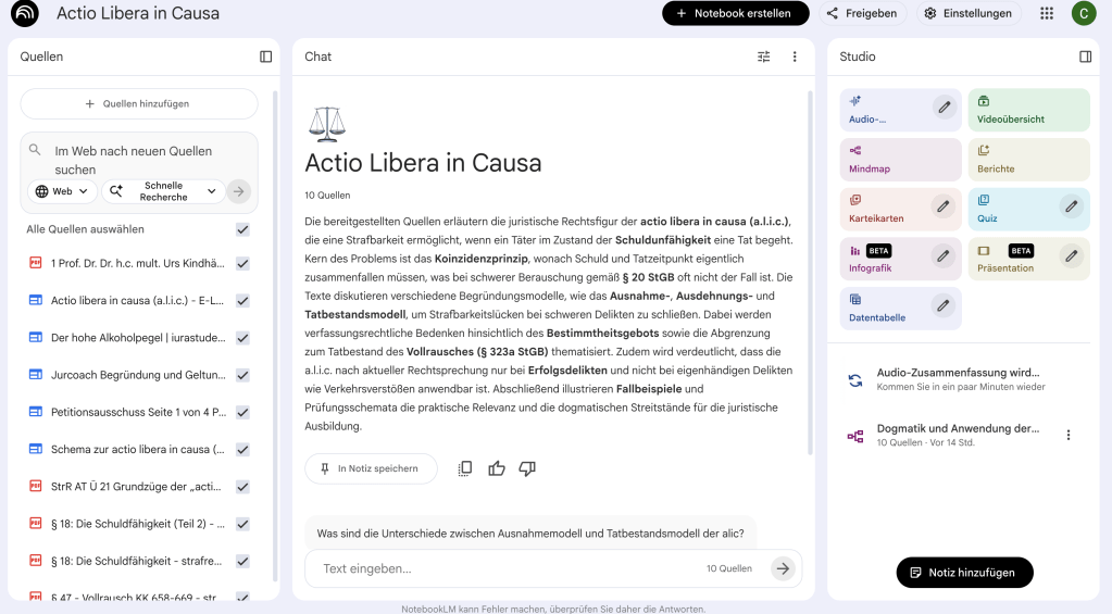 Sich Inspiration von ChatGPT für die Hausarbeit oder andere juristische Fragestellungen zu holen kann sinnvoll sein, sollte aber niemals ungeprüft übernommen werden. Teilweise ist die KI so überzeugt von ihrer eigenen Ansicht, dass sie auch auf mehrmaligen Hinweis nicht davon abrückt. Das sollte dich jedoch nicht beirren. Besonders in letzter Zeit habe ich häufiger das Gefühl, dass ich in juristischen Fragestellungen klüger bin als ChatGPT und dass zumindest meine Quellenarbeit, die des Programms um Meilen übertrifft. Gleiches gilt übrigens für die Planung von Reisen 😉