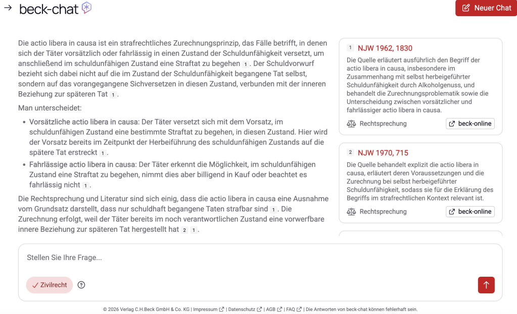 Die KI von beckonline ist ein guter Startpunkt für eine Recherche. Sie benutzt nur Quellen, die auf der Plattform existieren und verlinkt diese. Allerdings lohnt es sich, die Quellen zu prüfen, denn bei besonders seltenen Fragen liest die KI Dinge in ihre Quellen hinein, die dort nicht unbedingt stehen. Für die klassischen Fragen aus dem Studium, zu denen viel Literatur existiert, eignet sie sich jedoch allemal.