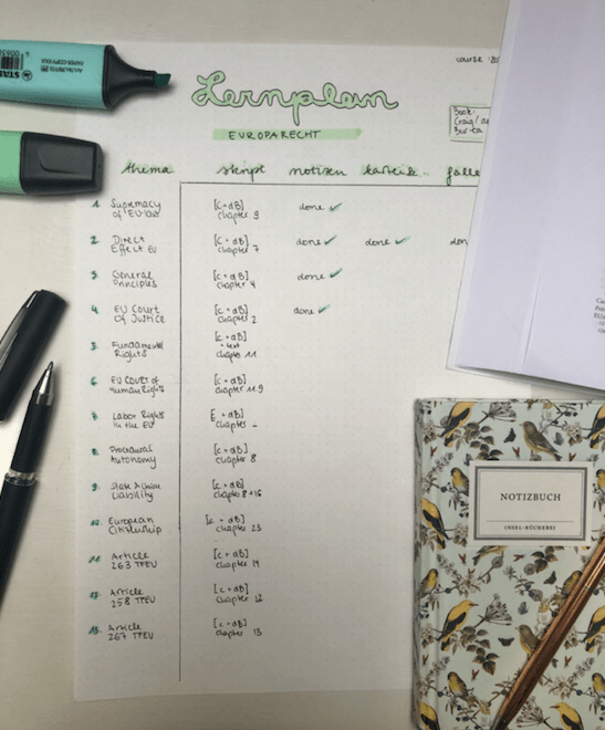 Ein leichter Schritt, sich zum Lernen aufzuraffen, ist es, Routinen zu entwickeln. Damit ist zum einen eine zeitliche Routine gemeint (z.B. jeden Montag von 09.00-14.00 in die Bibliothek zu gehen), aber auch bestimmte Abläufe zu automatisieren. Ich habe für mich persönlich den Ablauf entwickelt, mein Zimmer zu durchlüften, mir in der Zwischenzeit einen Kaffee zu kochen und dann als allererstes meinen Lernplan auf den neuesten Stand zu bringen. Beide Angewohnheiten haben den Vorteil, dass ich nicht jedes Mal überlegen muss, wann ich lerne und wie ich damit beginne.